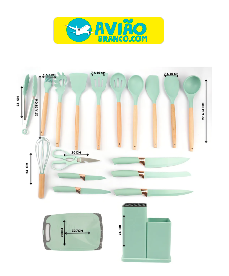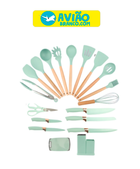 Seja o primeiro a avaliar “Kit 19 Utensílios De Cozinha Ke Home Cabo Madeira E Silicone Cor Verde Atacado”